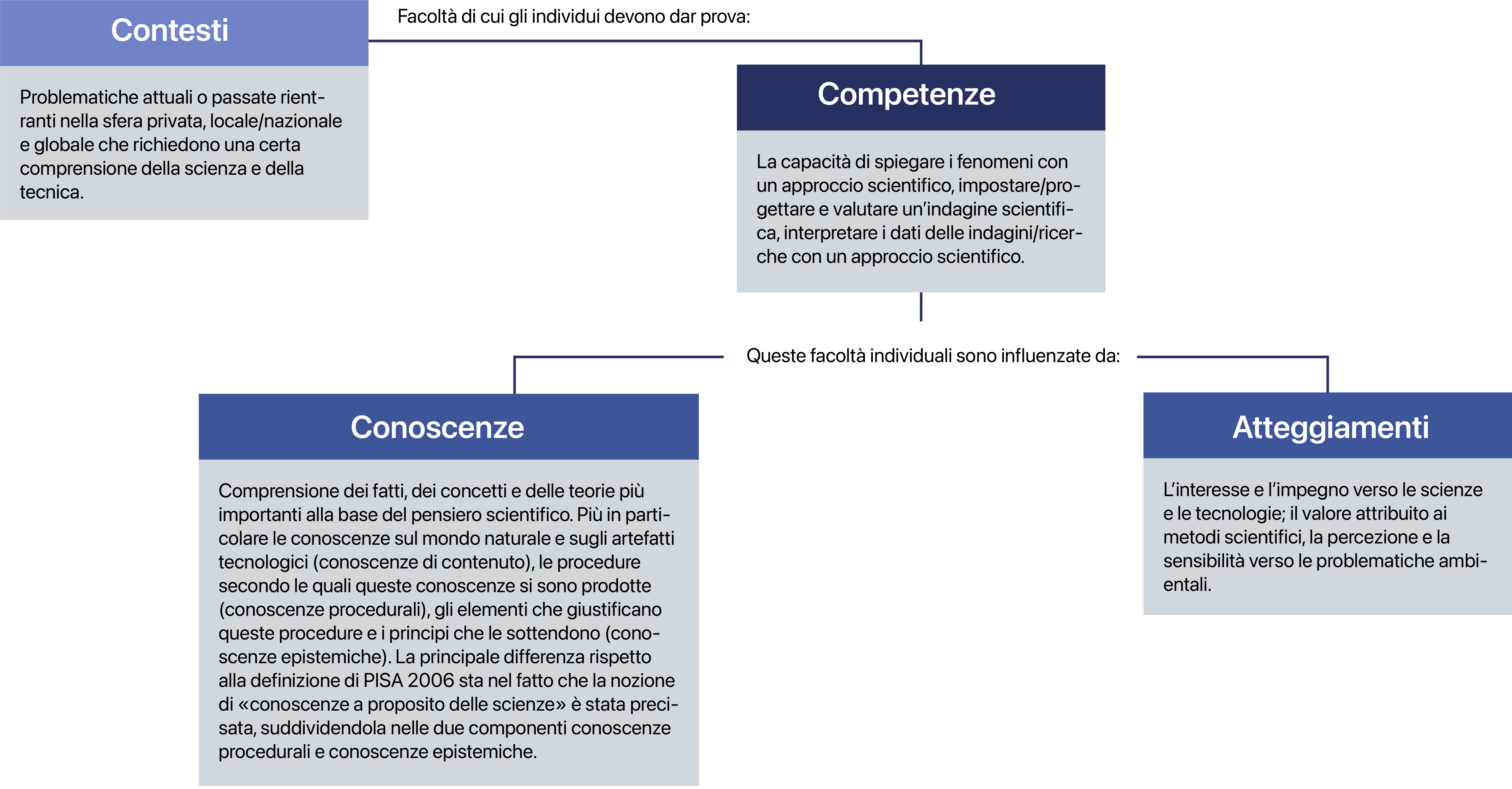 La literacy in scienze è costituita da tre competenze scientifiche e mostra le relazioni tra di esse: spiegare i fenomeni scientificamente, valutare e progettare una ricerca scientifica nonché interpretare dati e prove in modo scientifico. Le allieve e gli allievi utilizzano queste competenze in contesti specifici, che richiedono una certa comprensione della scienza e della tecnologia e si riferiscono generalmente a questioni personali, locali o globali.