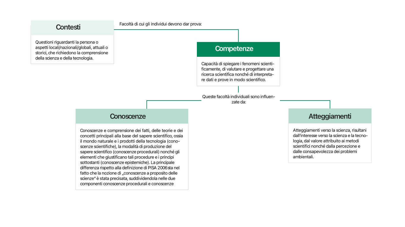 La literacy in scienze è costituita da tre competenze scientifiche e mostra le relazioni tra di esse: spiegare i fenomeni scientificamente, valutare e progettare una ricerca scientifica nonché interpretare dati e prove in modo scientifico. Gli allievi utilizzano queste competenze in contesti specifici, che richiedono una certa comprensione della scienza e della tecnologia e si riferiscono generalmente a questioni