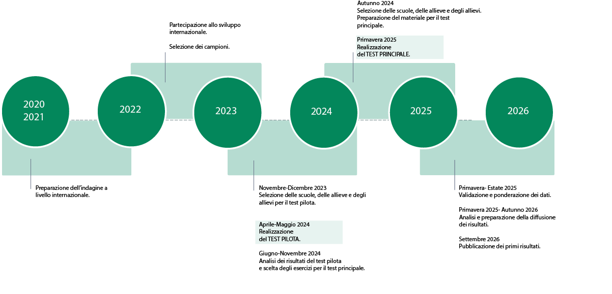 La preparazione, la realizzazione e l’analisi di un’indagine su larga scala e complessa come PISA richiede molto tempo. A livello internazionale, i lavori sono iniziati nel 2020 e la pubblicazione del rapporto nazionale della Svizzera sarà pubblicato nel dicembre 2026.
